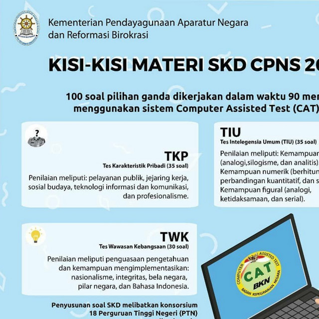 Berupa materi dan kisi kisi twk (tes wawasan kebangsaan), kisi kisi tiu (tes intelegensia umum), dan kisi kisi tkp (tes karakteristik pribadi) yang .